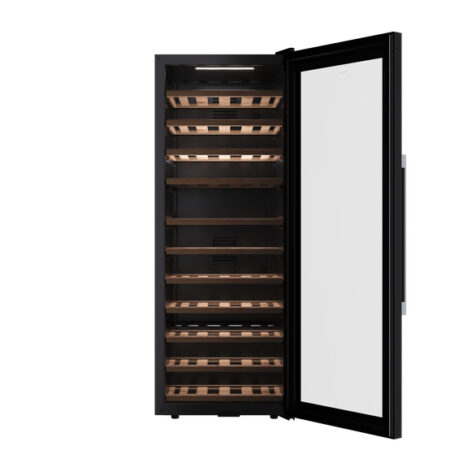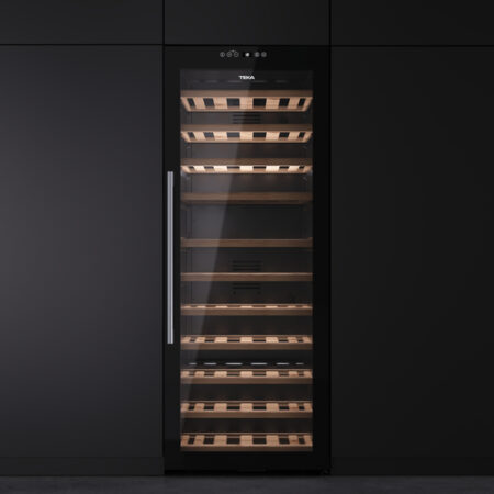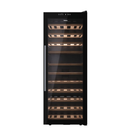 Teka RVF 10051 GBK. Apparaatplaatsing: Vrijstaand, Kleur behuizing: Zwart, Inwendige kleur: Zwart. Flessen-capaciteit: 51 fles(sen), Type product: Thermo-elektrische wijnkoeler, Klimaatklasse: SN-ST. Energie-efficiëntieklasse: G, Jaarlijks energieverbruik: 133 kWu, Energie-efficiëntieschaal: A tot G. Soort bediening: Knoppen, Soort lamp: LED. Breedte: 477 mm, Diepte: 475 mm, Hoogte: 1256,3 mm